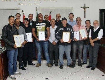 Com a participação de todos os vereadores, foram homenageados: Roque Luciano Garcia, conhecido como Neguinho, funcionário da Secretaria Municipal de Esportes; Edson Roberto Rossi – professor e secretário Municipal de Esportes (representado por Neguinho); os guardas civis municipais: William Santos da Silveira e Paulo Figueiredo Andrade – todas apresentadas pelo vereador Aécio Bisesto (Paraná-PTB); Osvaldo José dos Santos – primeiro Sargento da Polícia Militar, homenagem proposta por José Luis Vieira (Ratinho-PMDB); à Equipe de futebol Dez Estrelas F.C. – representada na cerimônia pelo senhor Moisés, iniciativa de Luiz Basso (PR) e Glalson Chamon (PSDB); e o atleta Fabrício Ubirajara de Assis, Moção proposta pelo presidente da Câmara, Marcelo Ferreira (dr. Marcelo-PSD).