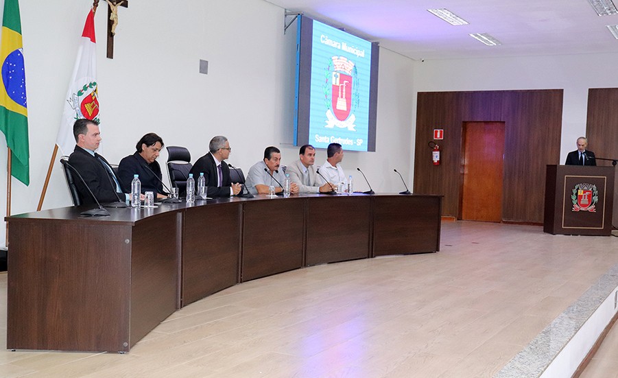 Na presença de grande público, que lotou o auditório da Câmara, Edmilson Valdanha comandou o cerimonial compondo a mesa com o Presidente da Casa, com os vereadores Willian Bento (PTB) e José Luis Vieira (Ratinho-MDB), o prefeito Rogério Pascon, o vice Glalson Chamon da Silva, e Henrique Macedo Neto – presidente da Câmara de Corumbataí.