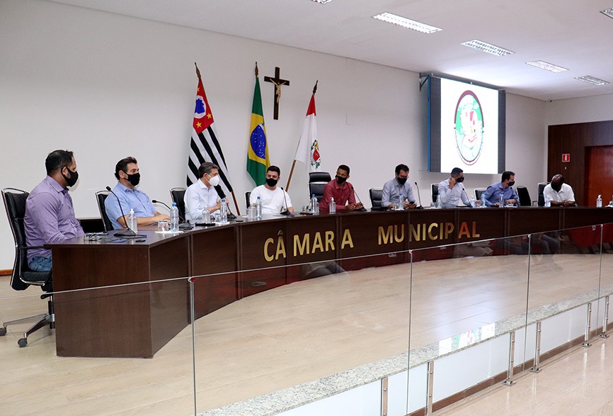 A mesa principal da reunião foi formada por Clayton do Espetinho, Luiz Basso, prefeito Gino, Bruno Lima, Sivaldo da Água, Alex de Madureira, Alan Basteli, Willian Bento e José Pereira – presidente da Câmara de Rio Claro.