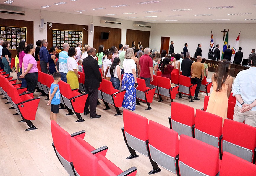 A 4ª sessão solene do ano foi presidida por Willian Bento (PTB), vice-presidente da Câmara. O Vereador abriu os trabalhos e, na sequência, o mestre de cerimônia, Edmilson Valdanha, deu sequência à parte protocolar e convidou o autor da propositura, vereador Washington Luiz Pereira (Washington dos Vasos-PSDB), a fazer a entrega da placa de honra ao mérito a Pedro Ricardo Neri.