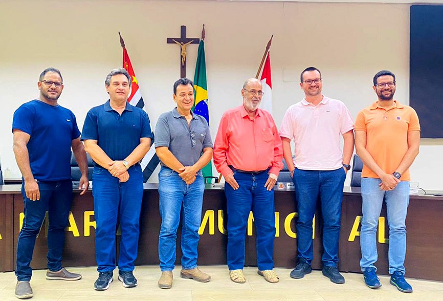 Nas fotos, Clayton Robert Santos Barros (Clayton do Espetinho-Republicanos), Luiz Basso, Washington Luiz Pereira (Washington dos Vasos-PSDB), o presidente dr. Marcelo Ferreira (Dr. Marcelo-PL), o secretário Felipe Penedo, e Alan Felipe Basteli (PSD).