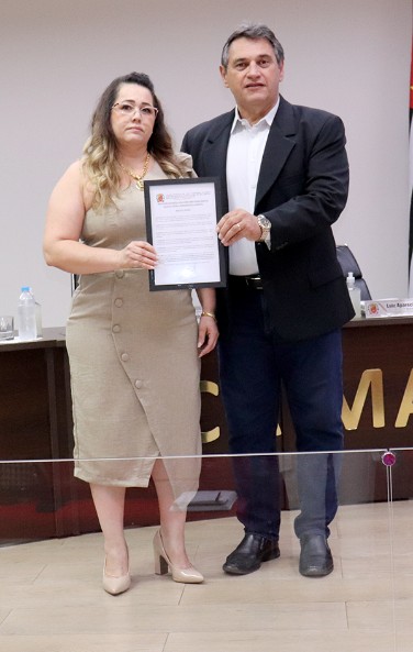 O presidente da Casa, Marcelo Ferreira (Dr. Marcelo-PL), iniciou sessão de homenagens convidando vereador autor da propositura, Luiz Basso (PL), a realizar a entrega do certificado às professoras e coreógrafas Débora Bernardi e Maria Fernanda Faria, “pelo brilhante planejamento e execução” do XV Festival da Escola Municipal de Dança Elizandra Belotto. Impossibilitada de comparecer, Débora foi representada por Maria Fernanda.