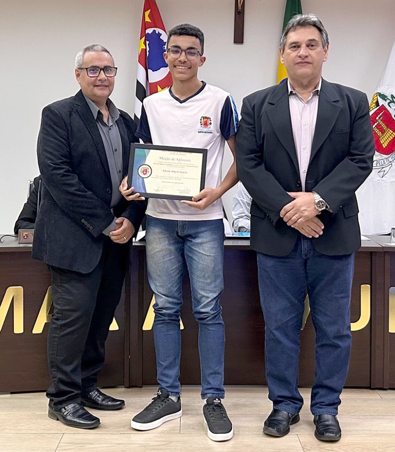 Adryan Miguel Soares, aluno da Emef Edna Teresa Fiório, foi condecorado pelas conquistas obtidas na Olimpíada Brasileira de Matemática das Escolas Públicas (OBMEP 2024): medalha de ouro no regional e de prata no nacional, disputando com 18,3 milhões de estudantes de todo o Brasil. A moção foi indicação de Luiz Basso.