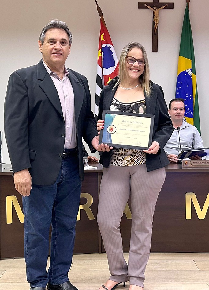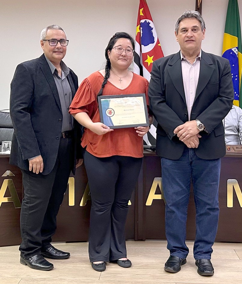 Basso deu prosseguimento às outorgas da honraria “pela contribuição à educação no Município”, principalmente pelo desempenho no Prêmio Destaque Educacional 2025, às professoras: Ana Paula Soares Oliveira, Beatriz de Almeida Freitas Zanotti, Carolina Meyer Barsi, Damaris C. dos Santos Siqueira Pires, Esméria Aparecida Tavolaro Marigo, Keiti Muller, Luciana de Souza Carvalho Guimarães, Marizete Alves Pereira de Deus, Mônica Osaco, Renata dos Santos Malheiros, Valdenice Aguiar e Vanessa do Carmo Felipe Dias.