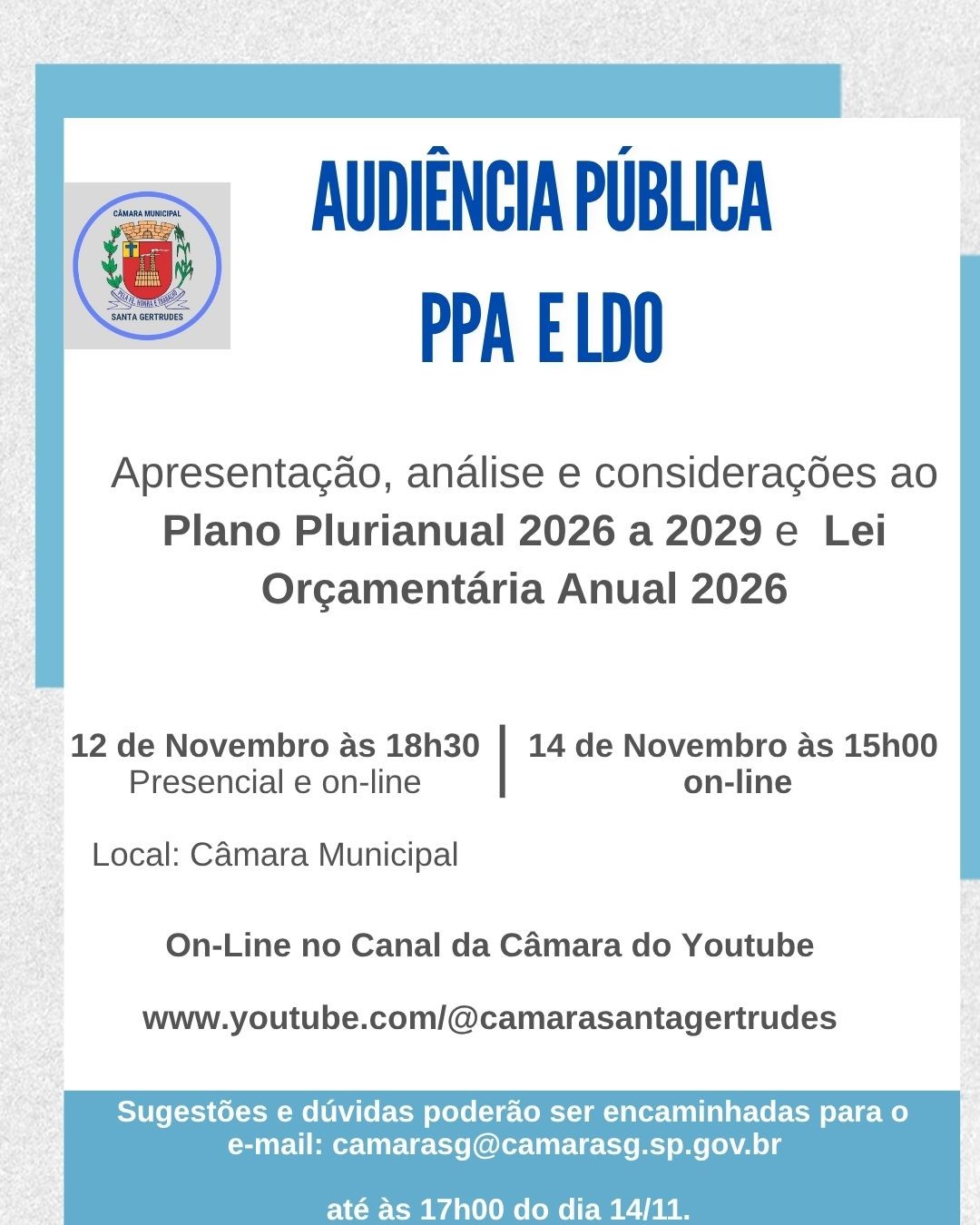 A comunidade deve participar atentamente e pode enviar sugestões ou sanar dúvidas pelo e-mail: camarasg@camarasg.sp.gov.br , até às 17 horas do dia 14 de novembro de 2025.