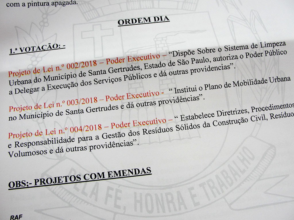 Após muitas reuniões e inserção de emendas, durante a 5ª sessão ordinária, realizada na noite do dia 13 de março, os vereadores aprovaram, em primeira votação, três projetos de lei complementares (PLCs), de autoria do Executivo, determinantes para equacionar problemas, estipulando direitos e deveres do Poder Público, dos munícipes e de empresas, PLC 2, sobre limpeza; PLC 3, plano de mobilidade urbana; e o PCL 4, estabelecendo critérios, procedimentos e responsabilidade na gestão de resíduos sólidos da construção civil. As cinco emendas aditivas e uma substitutiva foram aprovadas em sessão extraordinária, realizada no dia seguinte.