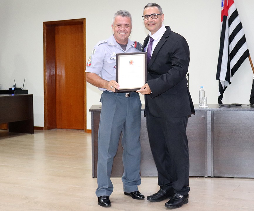 Após as leituras das proposituras e currículos dos homenageados, deu-se início as entregas das condecorações, iniciativas do vereador Antonio Carlos Candido. Foram chamados, um a um, primeiramente, os homenageados com Moções de Aplausos e Reconhecimento, os senhores: Gilmárcio Pires da Silva (2º Sargento da PM), Marcel Albis Ferro (presidente do Conseg - Conselho Comunitário de Segurança), e Telmo Xavier da Silva (3º Sargento PM) - autoria de Antonio Carlos e Willian Bento.