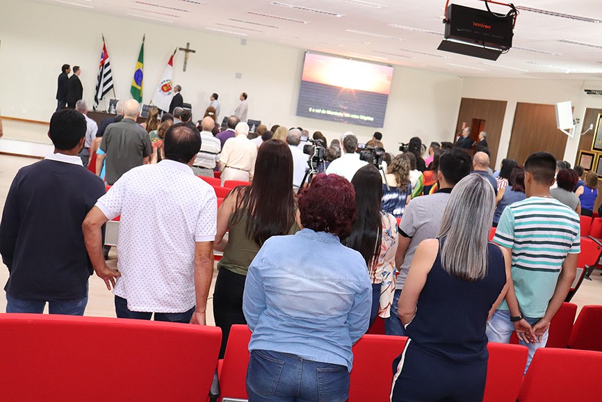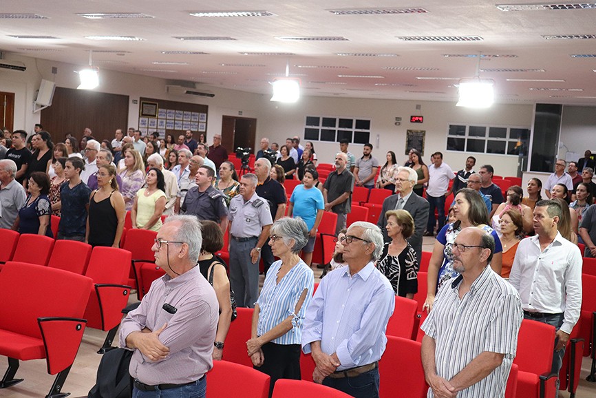 Na presença de grande público, que lotou o auditório da Câmara, Edmilson Valdanha comandou o cerimonial compondo a mesa com o Presidente da Casa, com os vereadores Willian Bento (PTB) e José Luis Vieira (Ratinho-MDB), o prefeito Rogério Pascon, o vice Glalson Chamon da Silva, e Henrique Macedo Neto – presidente da Câmara de Corumbataí.