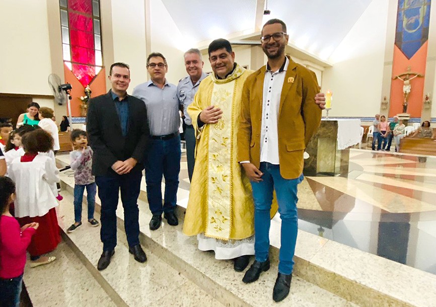 Os vereadores Alan Basteli (PSD), Luiz Basso (PL), Willian Bento (PTB), e a assessora parlamentar do legislador Clayton Robert Santos Barros (Clayton do Espetinho-Republicanos), Elaine Cristina Batistim Rauli, participaram da Missa Solene de Posse Canônica do novo Pároco da Paróquia São Joaquim, o Padre Paulo Sérgio Carlos, realizada no dia 2 de fevereiro, na Igreja Matriz.