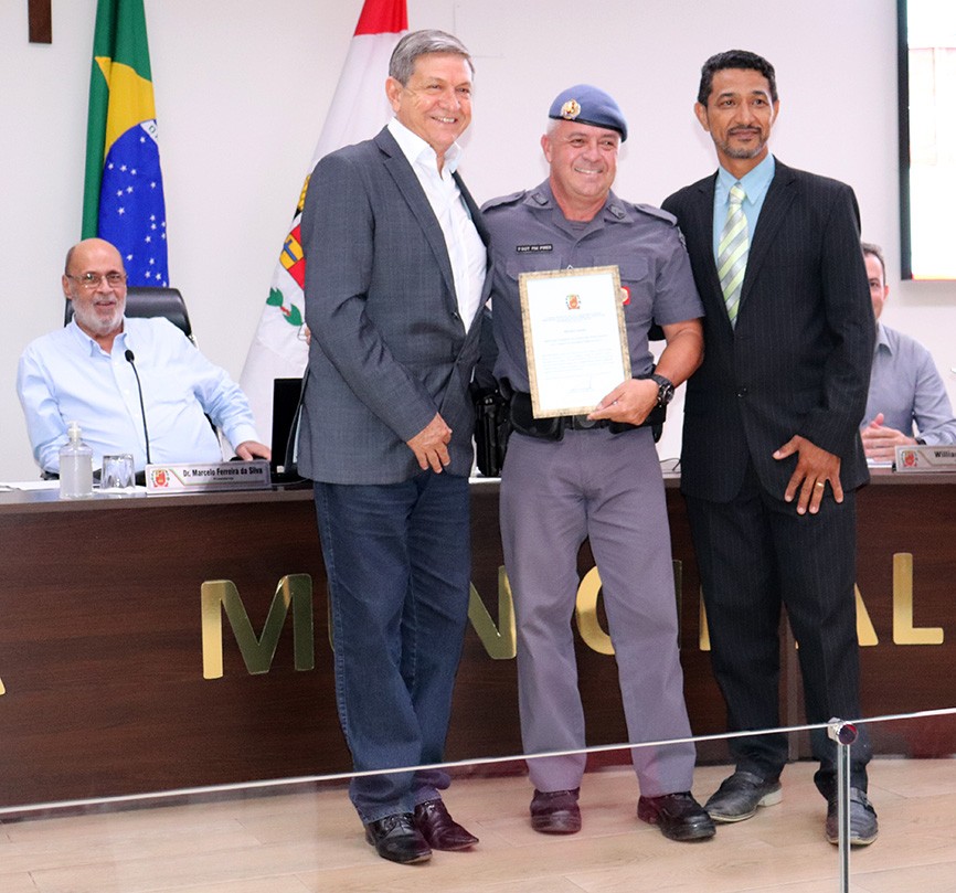Sivaldo da Água é o autor das moções de Parabéns, Aplausos e Reconhecimento entregues na noite aos policiais Gilmárcio Pires da Silva – segundo sargento da Polícia Militar – Pelotão de Santa Gertrudes, pelos “serviços prestados, proporcionando segurança e tranquilidade às famílias”; e ao tenente coronel André Luiz Pereira Leite Vianna, pelos serviços prestados ao 37º BPM/I - Rio Claro, pela quinta vez consecutiva, condecorado com o Prêmio Polícia Militar da Qualidade. O Vereador convidou o prefeito Lázaro Noé da Silva (Gino da Farmácia), a participar das entregas.