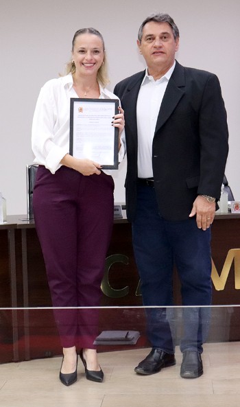 O presidente da Casa, Marcelo Ferreira (Dr. Marcelo-PL), iniciou sessão de homenagens convidando vereador autor da propositura, Luiz Basso (PL), a realizar a entrega do certificado às professoras e coreógrafas Débora Bernardi e Maria Fernanda Faria, “pelo brilhante planejamento e execução” do XV Festival da Escola Municipal de Dança Elizandra Belotto. Impossibilitada de comparecer, Débora foi representada por Maria Fernanda.