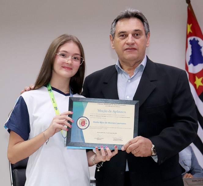 O vereador Luiz Aparecido Basso (PL) – vice-presidente da Câmara, fez a entrega oficial das moções de Parabéns, Aplausos e Reconhecimento aos alunos medalhistas na Olimpíada do Tesouro Direto de Educação Financeira (Olitef), e aos professores responsáveis pela qualificação dos estudantes. A sessão aconteceu no dia 2 de junho, no Plenário Íria Hansen, na sede do Legislativo.