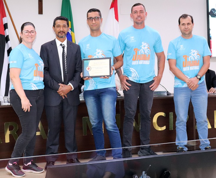 Sivaldo Elias agraciou a equipe organizadora do 3º Pedala Santa Gertrudes, evento beneficente que reuniu mais de 500 ciclistas, arrecadando ração destinada à entidade filantrópica Associação Amor em Quatro Patas, e caixas de leite que serão entregues ao Fundo Social de Solidariedade. A equipe foi representada por André Ricardo Silva, Adriel, Reilda Cristina de Assis Barboza e Luís Barboza.
